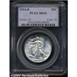 <B>1934-D<50C> MS65 PCGS.</B></I> In his <I>The Complete Guide to Walking Liberty Half Dollars,</B></I> Fox states that finding a fully struck '34-D with minimum abrasions is a difficult task. The present example, while not fully struck, still exhibits sharp detail in most areas, including Liberty's left hand area and the feathers on the eagle's left leg. As for abrasions, only a couple of milling marks appear on either side. <BR><BR><B>Important notice:</B> Heritage usually auctions material at the rate of 200-250 lots per hour. On some occasions eBay Live bid software or the Internet may not be able to keep up with the pace of the auction. We recommend placing a realistic absentee bid now as insurance to avoid disappointment. Occasionally the auctioneer may eliminate or reject an eBay Live bid, and the auctioneer may also reopen a lot after the close of the eBay live bidding (usually because we missed an audience bid), and may reject your bid even if it shows you as the winning bidder. By bidding via eBay Live, you agree that Heritage may award the lot to another bidder at its sole discretion under the circumstances described above or any other reasonable circumstances. Since eBay bids are not shown to us until we open the lot on the floor, we treat those bids just like floor bids. In most cases the floor responds before the eBay bid is presented to us, due to Internet lag time, so for consistency we have made it a policy that floor bids are always considered first over tie eBay live bids. Also please note that all Heritage lots purchased through eBay Live carry a 20% Buyer's Premium. Please make sure you read the Terms and Conditions before you bid.