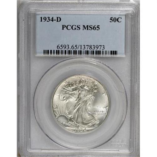 <B>1934-D 50C MS65 PCGS.</B></I> Vibrant luster and excellent detail are among the prime attributes of this attractive Depression-era Gem. The fields offer a touch of sky-blue patina, while the devices are predominantly silver-gray. Carefully preserved and immensely appealing.<BR><BR><B>Coin Engraver:</B> Adolph A. Weinman<BR><BR><b>Shipping:</b> Coins & Currency (<a target="_blank" href="http://www.heritageauctions.com/common/shipping.php">view shipping information</a>)