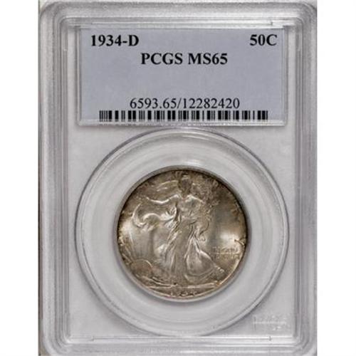 <B>1934-D 50C MS65 PCGS.</B></I> Lovely peripheral violet-rose toning and shimmering luster combine for splendid eye appeal on this D-mint Gem. Excellent eye appeal despite a touch of softness on the central devices.<BR><BR><B>Coin Engraver:</B> Adolph A. Weinman<BR><BR><b>Shipping:</b> Coins & Currency (<a target="_blank" href="http://www.heritageauctions.com/common/shipping.php">view shipping information</a>)