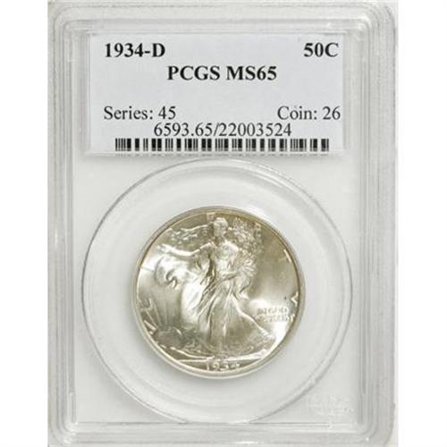 <B>1934-D 50C MS65 PCGS.</B></I> Pleasingly detailed for the issue with whispers of pink and gold against the frosty silver-white surfaces. A beautifully preserved survivor with vibrant visual appeal.<BR><I>From The Parker Lee III Collection.</B></I><BR><BR><B>Coin Engraver:</B> Adolph A. Weinman<BR><BR><b>Shipping:</b> Coins & Currency (<a target="_blank" href="http://www.heritageauctions.com/common/shipping.php">view shipping information</a>)