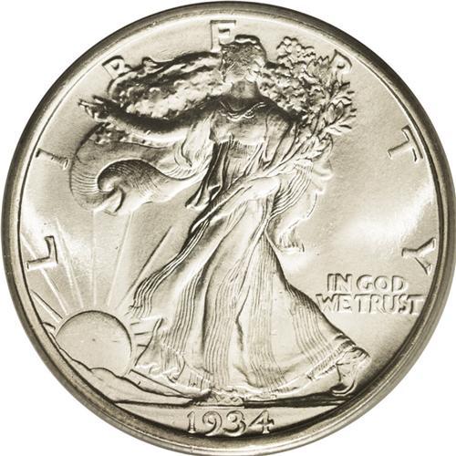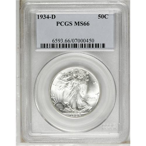 <B>1934-D<50C> MS66 PCGS.</B></I> An instantly appealing and blindingly lustrous silver-white blazer, well struck and with a split thumb on Liberty. Extremely high-end and nearly unimprovable, as NGC and PCGS combined have graded only three coins finer (7/06). Were it not for a couple of scrapes on Liberty's left (facing) wing, this coin might achieve an even higher grade.
