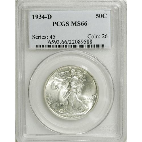 <B>1934-D 50C MS66 PCGS.</B></I> Blushes of pale gold toning deny full brilliance, but this nicely preserved Premium Gem has a sharp strike and comprehensive cartwheel luster. The first Denver Mint issue since 1929, when the Great Depression diminished commerce. PCGS and NGC combined have certified just three pieces finer (1/07).<BR><BR><b>Shipping:</b> Coins & Currency (<a target="_blank" href="http://www.heritageauctions.com/common/shipping.php">view shipping information</a>)