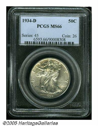 <B>1934-D<50C> MS66 PCGS.</B></I> Small D variety as on the early Denver Mint half dollars from 1917 through 1929. Bruce Fox discussed the elusive nature of this issue in top-quality: "As with so many other Denver issues, this date has a full range of strikes and doesn't exhibit much care during handling at the mint. Finding the full strike with minimum abrasions is a difficult task. Fully struck gems command premiums." This is a gorgeous Gem with brilliant silver luster and sharp design features on both sides. Only a couple tiny abrasions on Liberty's head keep this from a higher grade. We expect active participation by the specialists when this lot crosses the auction block. Population: 100 in 66, 2 finer (6/05).<BR><I>From The Robert Moreno Collection.</B></I>