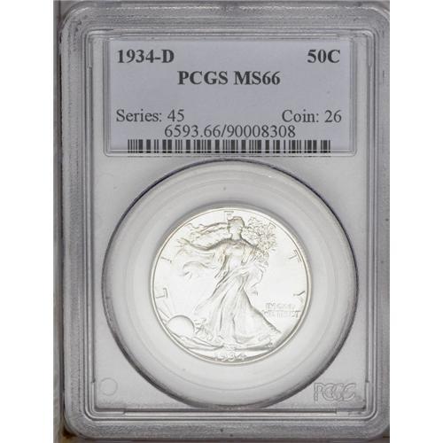 <B>1934-D<50C> MS66 PCGS.</B></I> Small D variety as on the early Denver Mint half dollars from 1917 through 1929. Bruce Fox discussed the elusive nature of this issue in top-quality: "As with so many other Denver issues, this date has a full range of strikes and doesn't exhibit much care during handling at the mint. Finding the full strike with minimum abrasions is a difficult task. Fully struck gems command premiums." This is a gorgeous Gem with brilliant silver luster and sharp design features on both sides. Only a couple tiny abrasions on Liberty's head keep this from a higher grade. We expect active participation by the specialists when this lot crosses the auction block. Population: 116 in 66, 2 finer (4/06).