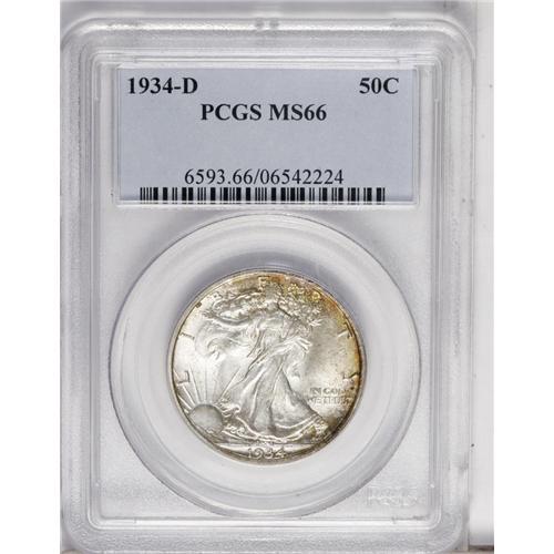 <B>1934-D<50C> MS66 PCGS.</B></I> The right margins exhibit golden-brown and apple-green, but this lustrous Premium Gem is otherwise nearly untoned. Sharply struck and refreshingly preserved. A small spot is found at 10:30. This Great Depression issue has a relatively low production of less than 2.4 million pieces. NGC and PCGS combined have certified just three pieces finer (9/06).