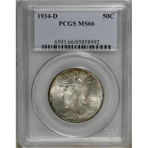 <B>1934-D 50C MS66 PCGS.</B></I> Crisply struck for this Denver issue with powerful luster. Each side is primarily silver-gray, though a striking crescent of golden-tan appears at the upper left obverse. PCGS has graded only two finer pieces (3/08).<BR><BR><B>Coin Engraver:</B> Adolph A. Weinman<BR><BR><b>Shipping:</b> Coins & Currency (<a target="_blank" href="http://www.heritageauctions.com/common/shipping.php">view shipping information</a>)