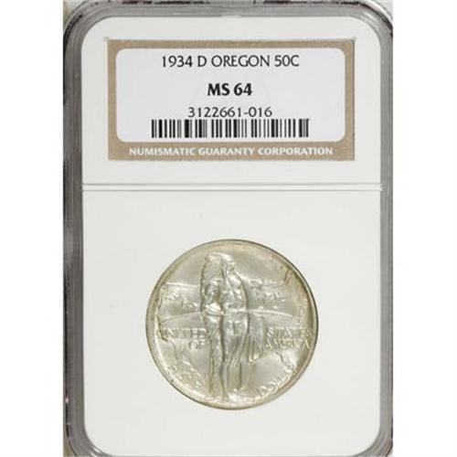 <B>1934-D 50C Oregon MS64 NGC.</B></I> . NGC Census: (386/697). PCGS Population (828/1091). Mintage: 7,006. Numismedia Wsl. Price for NGC/PCGS coin in MS64: $208. (#9344)<BR><BR><b>Shipping:</b> Coins & Currency (<a target="_blank" href="http://www.heritageauctions.com/common/shipping.php">view shipping information</a>)