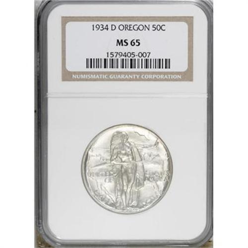 <B>1934-D 50C Oregon MS65 NGC.</B></I> NGC Census: (507/185). PCGS Population (756/330). Mintage: 7,006. Numismedia Wsl. Price for NGC/PCGS coin in MS65: $292. (#9344)<BR><BR><b>Shipping:</b> Coins & Currency (<a target="_blank" href="http://www.heritageauctions.com/common/shipping.php">view shipping information</a>)