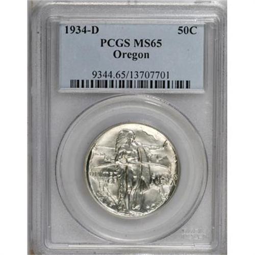 <B>1934-D 50C Oregon MS65 PCGS.</B></I> PCGS Population (752/327). NGC Census: (499/182). Mintage: 7,006. Numismedia Wsl. Price for NGC/PCGS coin in MS65: $292. (#9344)<BR><BR><b>Shipping:</b> Coins & Currency (<a target="_blank" href="http://www.heritageauctions.com/common/shipping.php">view shipping information</a>)