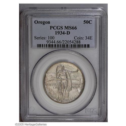 1934-D 50C Oregon MS66 PCGS. Whispers of light patinat 1934-D[50C] Oregon MS66 PCGS.