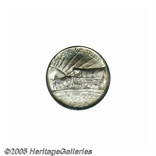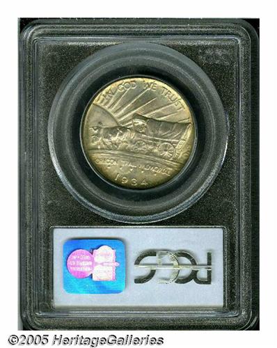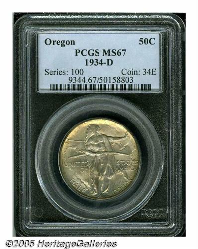 <B>1934-D<50C> Oregon MS67 PCGS.</B></I> Toned with attractive light sunset gold on the obverse and reverse, with the strike very sharp indeed. Excellent surfaces for this issue, and quite rare as such. The majority of these are found with handling nicks which knock them down the grading scale rather quickly. One of the best around, and none are seen finer by either NGC or PCGS. Population: 38 in 67, 0 finer (6/05).