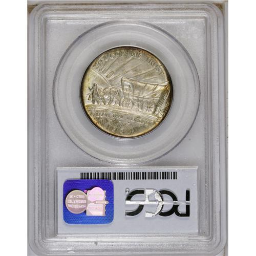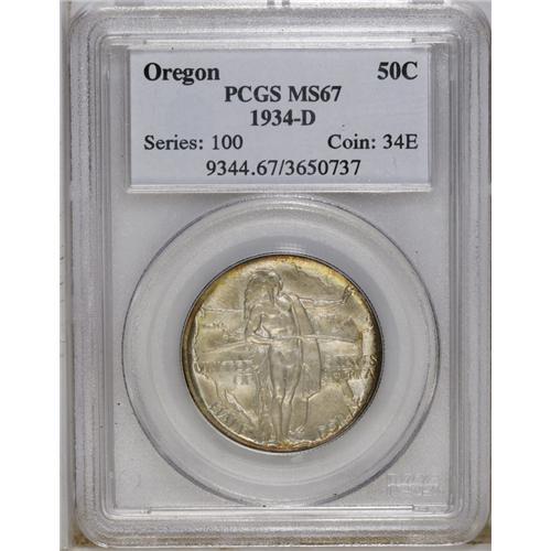 <B>1934-D 50C Oregon MS67 PCGS.</B></I> Well frosted olive-gray surfaces yield to appealing orange-gold peripheral accents. This shimmering Superb Gem has only minor contact, and the strike is bold aside from often encountered slight softness on the second T in STATES, and opposite on the back of the covered wagon. Only a small percentage of the already low mintage of 7,006 pieces survives at this outstanding grade level. Population: 44 in 67, 0 finer (12/06).<BR><BR><b>Shipping:</b> Coins & Currency (<a target="_blank" href="http://www.heritageauctions.com/common/shipping.php">view shipping information</a>)