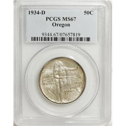 <B>1934-D 50C Oregon MS67 PCGS.</B></I> Typically bold beneath steel-gray and golden patina. An elite survivor from a mintage of just 7,006 pieces. Population: 47 in 67, 0 finer (7/07).<BR><BR><b>Shipping:</b> Coins & Currency (<a target="_blank" href="http://www.heritageauctions.com/common/shipping.php">view shipping information</a>\)