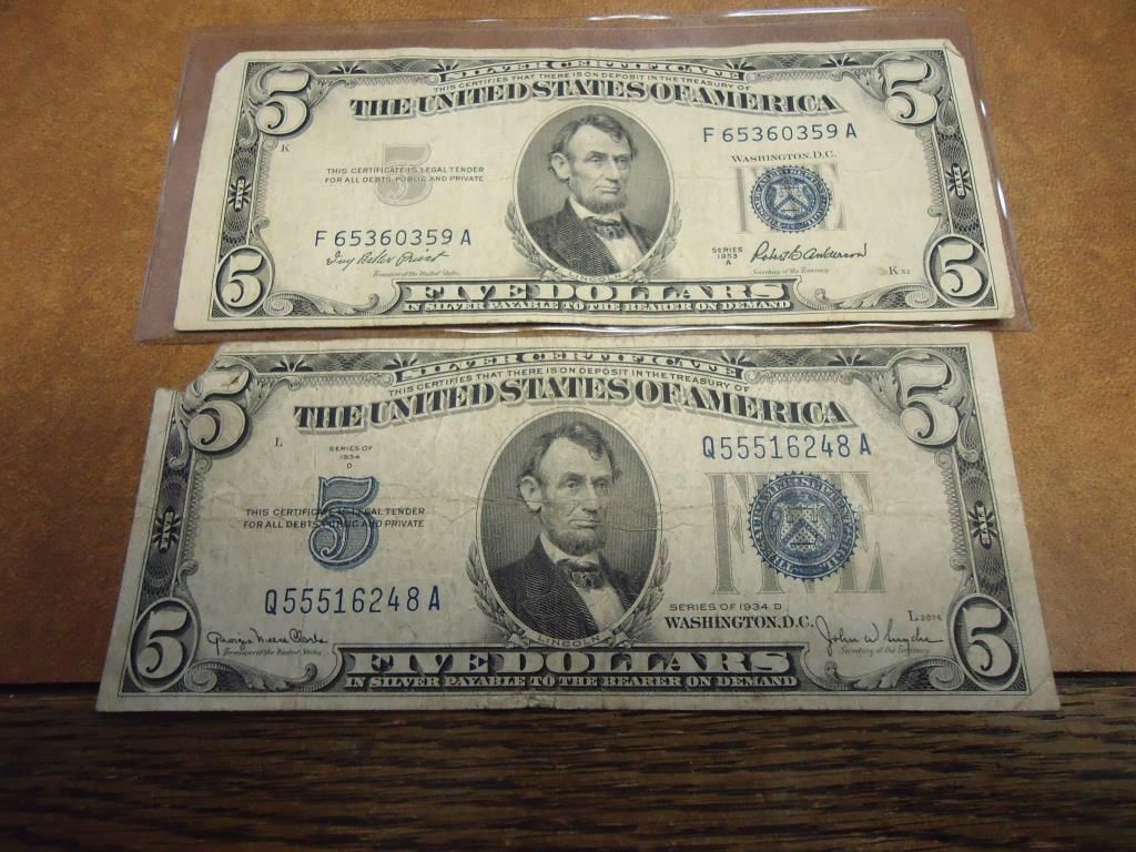 1934-D & 53-A $5 SILVER CERTIFICATES BLUE SEALS