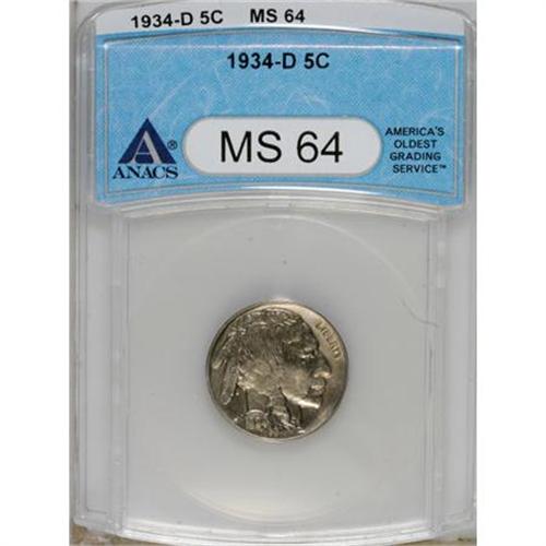 <B>1934-D 5C MS64 ANACS.</B></I> NGC Census: (516/96). PCGS Population (765/314). Mintage: 7,480,000. Numismedia Wsl. Price for NGC/PCGS coin in MS64: $208. (#3973)<BR><BR><b>Shipping:</b> Coins & Currency (<a target="_blank" href="http://www.heritageauctions.com/common/shipping.php">view shipping information</a>)