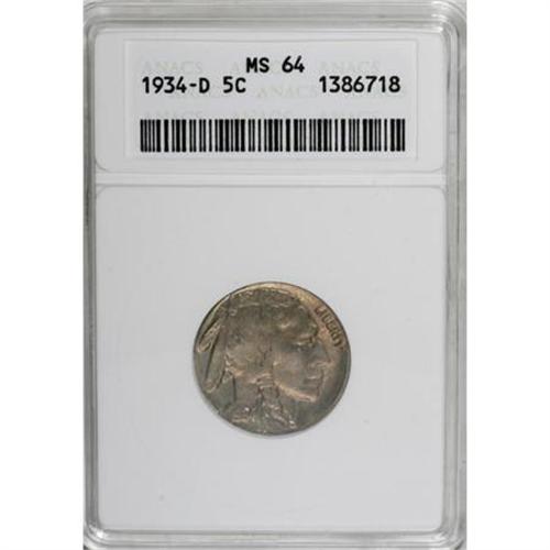 <B>1934-D 5C MS64 ANACS.</B></I> NGC Census: (521/96). PCGS Population (776/323). Mintage: 7,480,000. Numismedia Wsl. Price for NGC/PCGS coin in MS64: $208. (#3973)<BR><BR><B>Coin Engraver:</B> James E. Fraser<BR><BR><b>Shipping:</b> Coins & Currency (<a target="_blank" href="http://www.heritageauctions.com/common/shipping.php">view shipping information</a>)
