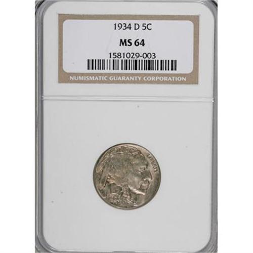 <B>1934-D 5C MS64 NGC.</B></I> NGC Census: (521/96). PCGS Population (770/321). Mintage: 7,480,000. Numismedia Wsl. Price for NGC/PCGS coin in MS64: $208. (#3973)<BR><BR><B>Coin Engraver:</B> James E. Fraser<BR><BR><b>Shipping:</b> Coins & Currency (<a target="_blank" href="http://www.heritageauctions.com/common/shipping.php">view shipping information</a>)