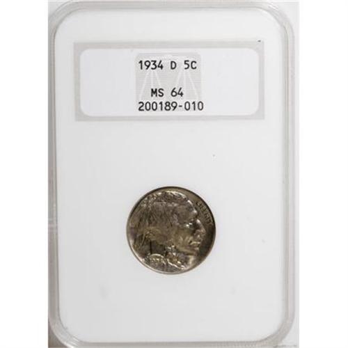 <B>1934-D 5C MS64 NGC.</B></I> NGC Census: (526/95). PCGS Population (779/326). Mintage: 7,480,000. Numismedia Wsl. Price for NGC/PCGS coin in MS64: $208. (#3973)<BR><BR><B>Coin Engraver:</B> James E. Fraser<BR><BR><b>Shipping:</b> Coins & Currency (<a target="_blank" href="http://www.heritageauctions.com/common/shipping.php">view shipping information</a>)
