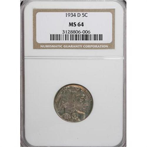 <B>1934-D 5C MS64 NGC.</B></I> NGC Census: (530/96). PCGS Population (770/331). Mintage: 7,480,000. Numismedia Wsl. Price for NGC/PCGS coin in MS64: $215. (#3973)<BR><BR><B>Coin Engraver:</B> James E. Fraser<BR><BR><b>Shipping:</b> Coins & Currency (<a target="_blank" href="http://www.heritageauctions.com/common/shipping.php">view shipping information</a>)