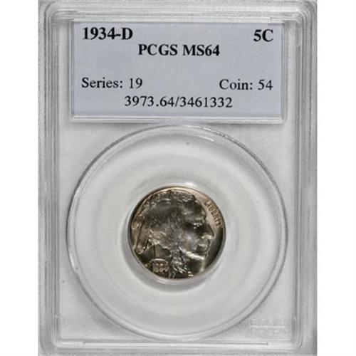 <B>1934-D 5C MS64 PCGS.</B></I> PCGS Population (770/320). NGC Census: (521/96). Mintage: 7,480,000. Numismedia Wsl. Price for NGC/PCGS coin in MS64: $208. (#3973)<BR><BR><B>Coin Engraver:</B> James E. Fraser<BR><BR><b>Shipping:</b> Coins & Currency (<a target="_blank" href="http://www.heritageauctions.com/common/shipping.php">view shipping information</a>)