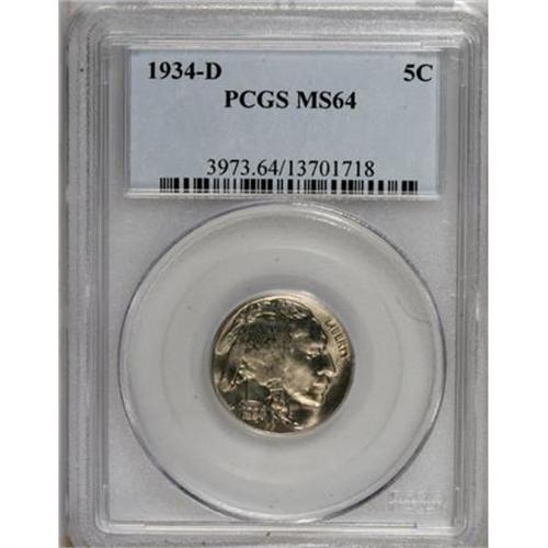 <B>1934-D 5C MS64 PCGS.</B></I> PCGS Population (772/323). NGC Census: (521/96). Mintage: 7,480,000. Numismedia Wsl. Price for NGC/PCGS coin in MS64: $208. (#3973)<BR><BR><B>Coin Engraver:</B> James E. Fraser<BR><BR><b>Shipping:</b> Coins & Currency (<a target="_blank" href="http://www.heritageauctions.com/common/shipping.php">view shipping information</a>)