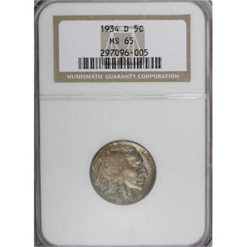 <B>1934-D 5C MS65 NGC.</B></I> NGC Census: (89/7). PCGS Population (283/40). Mintage: 7,480,000. Numismedia Wsl. Price for NGC/PCGS coin in MS65: $720. (#3973)<BR><BR><B>Coin Engraver:</B> James E. Fraser<BR><BR><b>Shipping:</b> Coins & Currency (<a target="_blank" href="http://www.heritageauctions.com/common/shipping.php">view shipping information</a>)