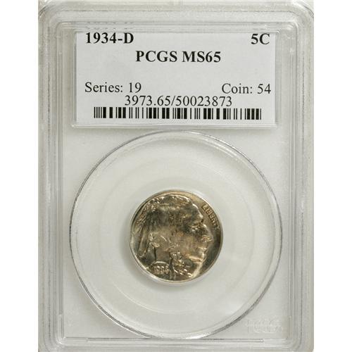<B>1934-D 5C MS65 PCGS.</B></I> A sharply defined and lustrous Gem that displays light golden color across each side. Spindly die cracks extend across the Indian's cheek and through the upper hair details. Small blemishes are noted on the bison's rump and the Indian's chin area.<BR><BR><b>Shipping:</b> Coins & Currency (<a target="_blank" href="http://www.heritageauctions.com/common/shipping.php">view shipping information</a>)