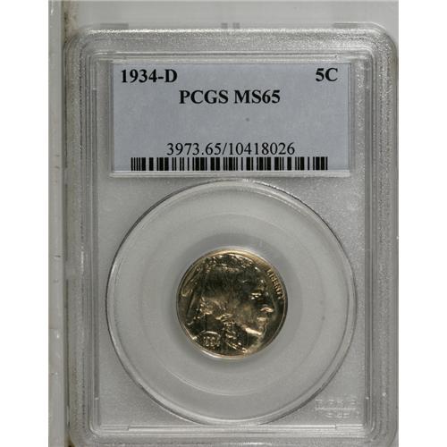 <B>1934-D 5C MS65 PCGS.</B></I> Traces of rose and gold toning are present on the mercury-luster surfaces. Nicely struck with a few isolated marks on the bison's body.<BR><BR><b>Shipping:</b> Coin/Currency (<a target="_blank" href="http://www.heritageauctions.com/common/shipping.php">view shipping information</a>)