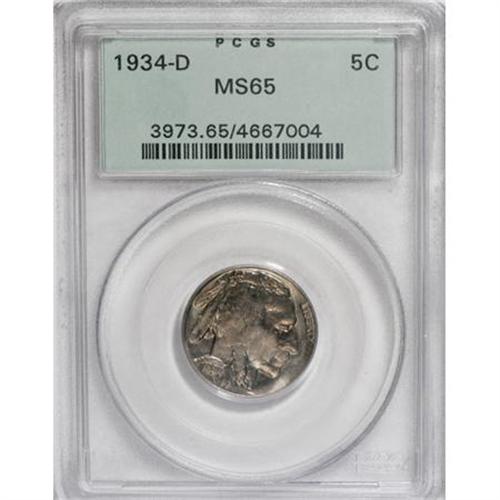 <B>1934-D 5C MS65 PCGS.</B></I> Gold, lilac, and olive tints enrich this mildly prooflike Gem. Nearly unabraded, but the centers and tail are a bit soft, as usual for the issue. Encapsulated in a green label holder.<BR><I>From The Vanek Collection.</B></I><BR><BR><b>Shipping:</b> Coins & Currency (<a target="_blank" href="http://www.heritageauctions.com/common/shipping.php">view shipping information</a>)