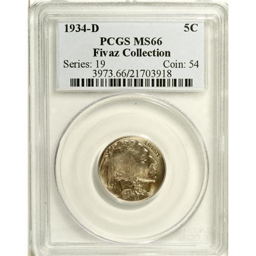 <B>1934-D 5C MS66 PCGS.</B></I> Ex: Fivaz Collection. Solidly struck overall with delicate blue-green, violet-pink, and champagne patina over each side. The luster is pleasing, and the fields and devices display few marks, even for this lofty grade. Tied for the finest certified by either NGC or PCGS (12/06).<BR><BR><b>Shipping:</b> Coin/Currency (<a target="_blank" href="http://www.heritageauctions.com/common/shipping.php">view shipping information</a>)