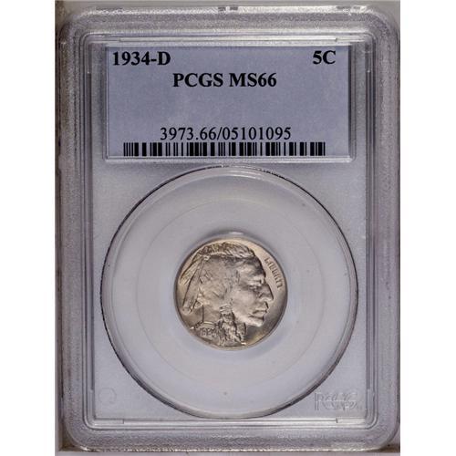 <B>1934-D<5C> MS66 PCGS.</B></I> One of the better known strike rarities in the Buffalo nickel series, this issue is from the 1930-38 Short Set. Very few sharply struck Gem examples have been certified by either of the major services over the past ten years, and it seems that this issue's semi-key status is now well assured. This is a well defined coin that has satiny luster and is untoned on each side. Population: 32 in 66, 0 finer (3/06). <BR><BR><B>Important notice:</B> Heritage usually auctions material at the rate of 200-250 lots per hour. On some occasions eBay Live bid software or the Internet may not be able to keep up with the pace of the auction. We recommend placing a realistic absentee bid now as insurance to avoid disappointment. Occasionally the auctioneer may eliminate or reject an eBay Live bid, and the auctioneer may also reopen a lot after the close of the eBay live bidding (usually because we missed an audience bid), and may reject your bid even if it shows you as the winning bidder. By bidding via eBay Live, you agree that Heritage may award the lot to another bidder at its sole discretion under the circumstances described above or any other reasonable circumstances. Since eBay bids are not shown to us until we open the lot on the floor, we treat those bids just like floor bids. In most cases the floor responds before the eBay bid is presented to us, due to Internet lag time, so for consistency we have made it a policy that floor bids are always considered first over tie eBay live bids. Also please note that all Heritage lots purchased through eBay Live carry a 20% Buyer's Premium. Please make sure you read the Terms and Conditions before you bid. This lot is being auctioned in conjunction with a live floor auction by Heritage Galleries & Auctioneers. All final auction and invoice information will be supplied by Heritage Galleries & Auctioneers, and all other information should be considered preliminary. Lot:1118 <BR><BR><B>Winning Notification and Billing:</B> After the FINAL session in this auction is complete, Heritage will send e-mail and snail mail invoices. This process normally takes several days. All final auction and invoice information will be supplied by Heritage Galleries & Auctioneers, and all other information should be considered preliminary. <BR><BR>This auction will be conducted on a live auction floor and over the Internet through eBay Live. If you choose to place an absentee bid, please take a moment to <font color='#0000ff'><u><a href='http://pages.ebay.com/liveauctions/help/before/laabsentee.html'>learn how eBay Live absentee bidding works</a></u></font><font color='#000000'>