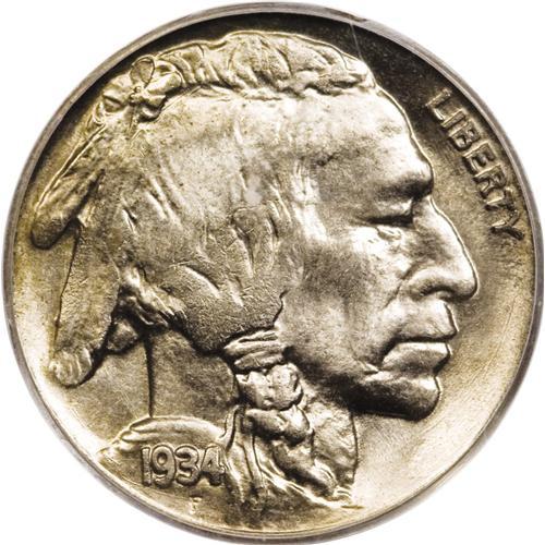 <B>1934-D 5C MS66 PCGS.</B></I> The surfaces are brilliant, with just a slight tinge of golden color, and dazzling luster emanates from each side. The strike is somewhat soft on the Indian's braid and on the shoulder highpoints, but the tail is split, and the horn and fur on the upper Buffalo are bold. Despite the mintage exceeding 7.4 million pieces, this coin is one of only 38 Premium Gems at PCGS, with none finer (4/07).<BR><BR><b>Shipping:</b> Coins & Currency (<a target="_blank" href="http://www.heritageauctions.com/common/shipping.php">view shipping information</a>)