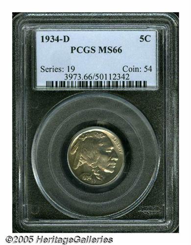 <B>1934-D<5C> MS66 PCGS.</B></I> This is one of the finest certified examples of this often weak, D-mint production. A generally untoned appearance is seen over the smooth, distraction-free surfaces. The features are above average in striking definition with unbroken satiny luster. Population: 32 in 66, none finer at either service (6/05).