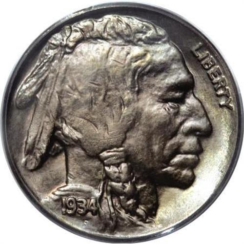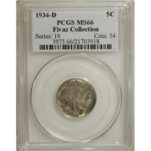 <B>1934-D 5C MS66 PCGS.</B></I> Ex: Fivaz Collection. While weak strikes are the rule for this date, this Premium Gem is solidly struck overall, and exhibits delicate blue-green, violet-pink, and champagne patina over each side. The luster is pleasing, and the fields and devices display no significant marks. Population: 40 in 66, 0 finer (7/07).<BR><BR><B>Coin Engraver:</B> James E. Fraser<BR><BR><b>Shipping:</b> Coins & Currency (<a target="_blank" href="http://www.heritageauctions.com/common/shipping.php">view shipping information</a>\)