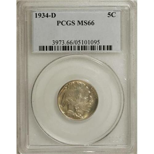 <B>1934-D 5C MS66 PCGS.</B></I> One of the better known Buffalo nickel strike rarities, the 1934-D is a key issue from the abbreviated 1934-38 set. Very few sharply struck Gem examples have been certified by either of the major services, which has elevated its status among the later dates in the series. This is a well defined coin that has satiny luster and is untoned on each side. Population: 40 in 66, 0 finer (7/07).<BR><BR><B>Coin Engraver:</B> James E. Fraser<BR><BR><b>Shipping:</b> Coins & Currency (<a target="_blank" href="http://www.heritageauctions.com/common/shipping.php">view shipping information</a>\)