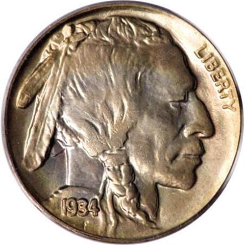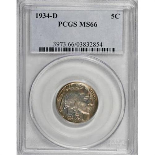 <B>1934-D 5C MS66 PCGS.</B></I> Locating a sharply struck 1934-D nickel with full luster is challenging. The Premium Gem in this lot has been the recipient of a well directed strike, as the design elements are crisply defined. Just a hint of softness is seen in portions of the bison's hair. Well cared for surfaces exhibit effusive luster, and are attractively toned in iridescent rainbow hues. Population: 40 in 66, 0 finer (8/07).<BR><BR><B>Coin Engraver:</B> James E. Fraser<BR><BR><b>Shipping:</b> Coins & Currency (<a target="_blank" href="http://www.heritageauctions.com/common/shipping.php">view shipping information</a>)