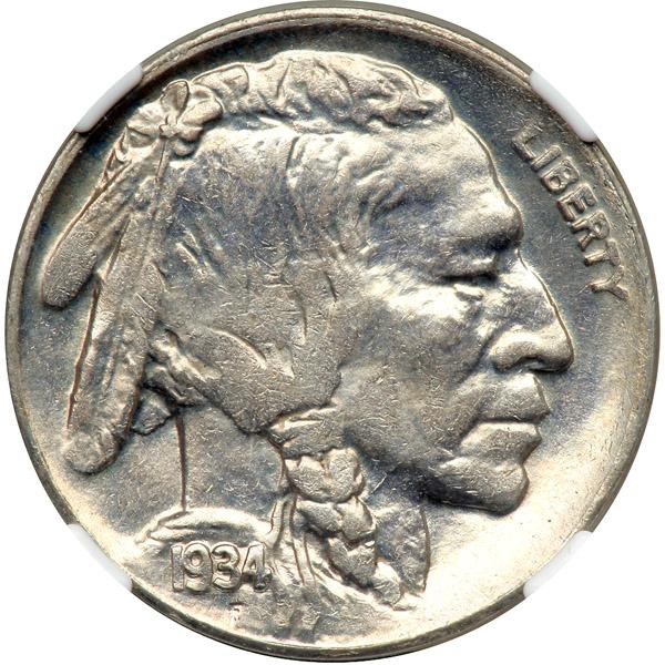 1934-D Buffalo Nickel. NGC graded MS-64. The "934" of the date is actually doubled. Nicely toned and choice. Possibly scarce (PCGS # 3973) .