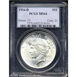 <B>1934-D<img border='0' src='http://www.heritagecoins.com/images/star.gif' width=10 height=10>$1 MS64 PCGS.</B></I> Small D mintmark. A well struck and lustrous near-Gem with refreshingly clean surfaces. A pleasing better date Silver Dollar. Lot:10740