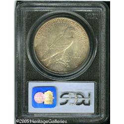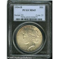 <B>1934-D<img border='0' src='http://www.heritagecoins.com/images/star.gif' width=10 height=10>$1 MS65 PCGS.</B></I> Bright, coruscant, satiny luster graces both sides of this key date Peace dollar. A boldly struck example, with creamy golden-gray and pleasing russet peripheral toning on both obverse and reverse. Lot:10742