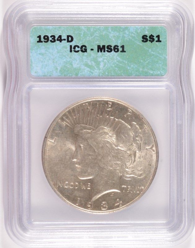 1934-D PEACE SILVER DOLLAR, ICG MS-61 WHITE