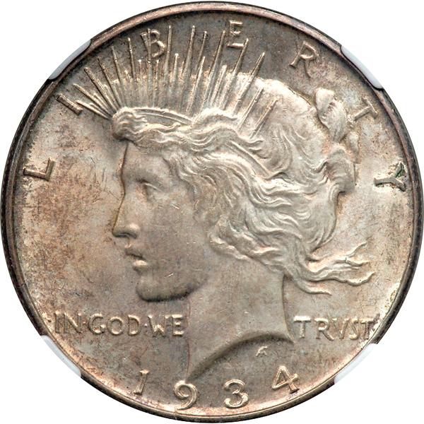 1934-D Peace Dollar. NGC graded MS-63 PQ. Lovely golden toning. Also comes with a PCGS MS63 tag.