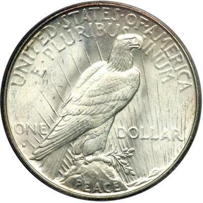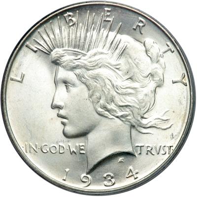 1934-D Peace Dollar. PCGS graded MS-64. A nice frosty example of this more desirable D-mint issue (PCGS # 7376).
