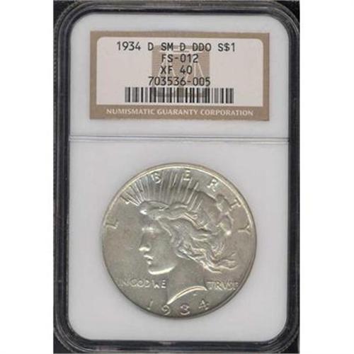 <b>1934-D Peace Dollar. NGC graded SM D DDO FS-012 EF40.</b> Noticeable doubling at the date and IN GOD WE on this scarcer variety from 1934 <b>(PCGS # 7376)</b>
