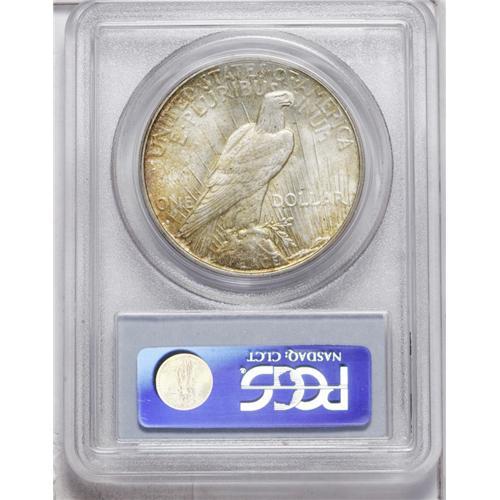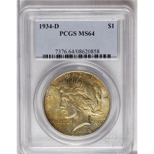 <B>1934-D<img border='0' src='http://www.heritagecoins.com/images/star.gif' width=10 height=10>$1> MS64 PCGS.</B></I> Medium D. VAM-3. A Top 50 Variety. IN GOD WE is strongly die doubled, as is Liberty's profile. Rich golden-brown and olive toning drapes lustrous near-Gem. At first glance, the piece appears to merit an even higher grade, but a hair-thin mark on the cheek is noted when viewed at odd angles.