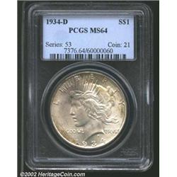 1934-D S$1 MS64 PCGS. The dusky russet and green-gray patina is largely confined to the peripheries.