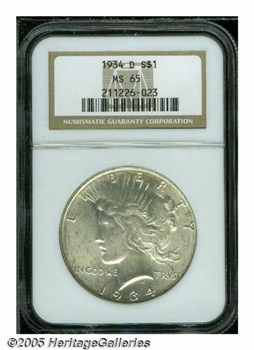 <B>1934-D<S$1> MS65 NGC.</B></I> A lightly toned and lustrous Gem that has an impressive strike and carefully preserved surfaces. A small contact mark on the head of the eagle is the only conceivable distraction.