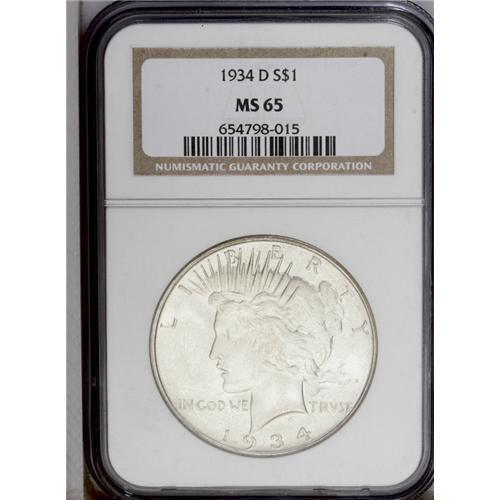 <B>1934-D<img border='0' src='http://www.heritagecoins.com/images/star.gif' width=10 height=10>$1> MS65 NGC.</B></I> Small D. The design elements are well struck throughout, and a thin veil of faint gray color visits surfaces that reveal a few light marks consistent with the assigned grade. Both sides are bursting with bright, coruscant, satiny luster, and a smooth, pleasing appearance overall. A scarce date coin in this very desirable grade.