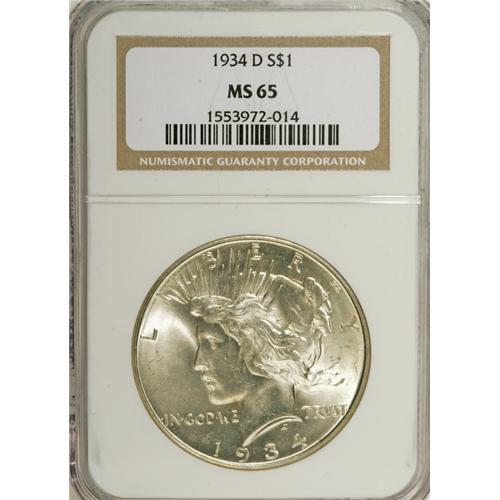 <B>1934-D S$1 MS65 NGC.</B></I> This extremely lustrous Gem has a hint of frost on each side. Solidly struck with trivial marks and a blush of gold in the reverse fields.<BR><BR><b>Shipping:</b> Coins & Currency (<a target="_blank" href="http://www.heritageauctions.com/common/shipping.php">view shipping information</a>)
