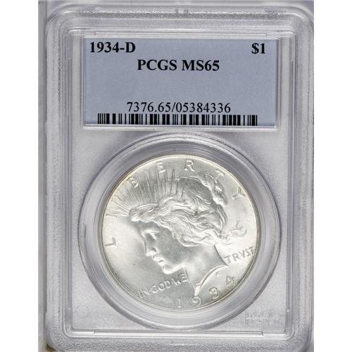<B>1934-D<img border='0' src='http://www.heritagecoins.com/images/star.gif' width=10 height=10>$1> MS65 PCGS.</B></I> Olive and lavender converge in the subtle patina of this late-date Gem. Strongly detailed for this issue with excellent luster and only a few widely dispersed marks.