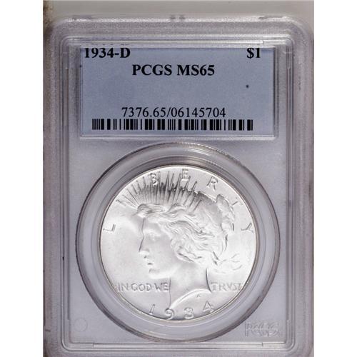 <B>1934-D<img border='0' src='http://www.heritagecoins.com/images/star.gif' width=10 height=10>$1> MS65 PCGS.</B></I> Small D. Dazzling luster and a clean obverse confirm the quality of this brilliant better date dollar. The strike is bold despite a trace of softness on the eagle's wing above the leg.